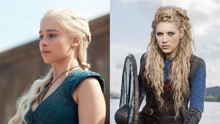 Clairement on voit double entre les deux personnages féminins les plus forts du petit écran. A notre gauche, Daenerys et ses cheveux blancs de blancs tressés et lâchés et à notre droite, Queeeeeen Lagertha et sa chevelure blonde. Impossible de ne pas se dire qu’elles se conseillent mutuellement pour leurs coiffures.