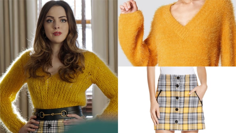 Si vous voulez oser le total look jaune façon Fallon Carrington, on vous recommande NA-KD pour le pull + le classique Nordstorm pour la mini-jupe.