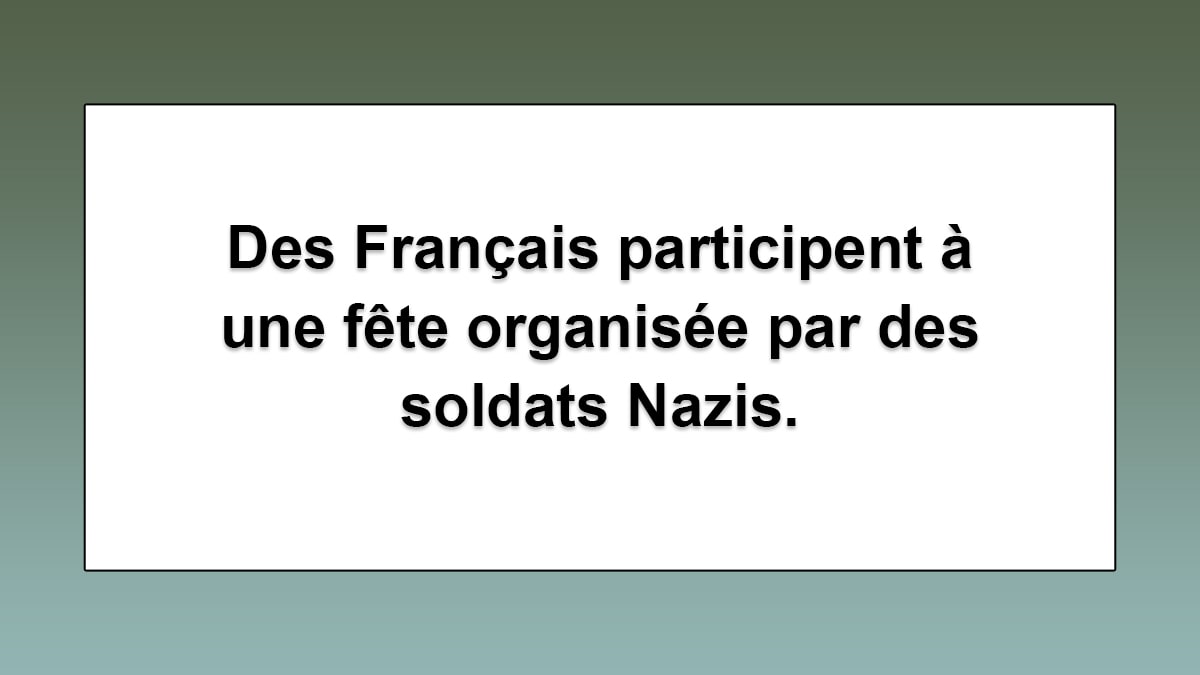 Ce sont Augustin et Stanislas qui prennent part à une fête organisée par des Nazis, à l’hôtel du Globe, tandis qu’ils se font passer pour les maris des deux tenantes.
