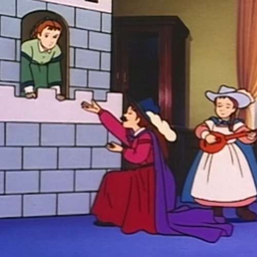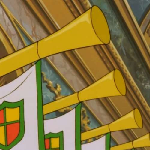 L’image du générique du dessin animé Princesse Sarah est celle ou l’on aperçoit des drapeaux et des trompettes.