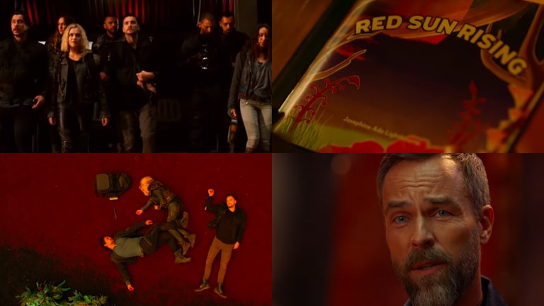 Clarke lit une comptine : « Quand les étoiles s’alignent et que la forêt se réveille, il est temps de s’enfuir. Les amis deviennent ennemis, et peu sont sains et saufs une fois exposés« . Une lecture accompagnée d’images des héros s’affrontant entre eux, alors qu’un nouveau visage fait son apparition : Russell, incarné par JR Bourne. Il ne leur fait pas confiance et met en doute leur capacité à rester en paix.